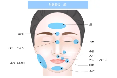 額(16単位/¥9,600)、眉間(12単位/¥7,200)、目尻(12単位/¥7,200)、目の下(8単位/¥4,800)、鼻根(8単位/¥4,800)、小鼻(8単位/¥4,800)、バニーライン(8単位/¥4,800)、あご(8単位/¥4,800)、エラ(40単位/¥24,000)、エラ(80単位/¥48,000)、下腿(240単位/¥144,000)、ガミースマイル(8単位/¥4,800)、口角(4単位/¥2,400)、口上(8単位/¥4,800)、口下(8単位/¥4,800)、人中(6単位/¥3,600)、脇ショート(60単位/¥36,000)、脇トール(80単位/¥48,000)、脇グランデ(100単位/¥60,000)、脇ベンティ(120単位/¥72,000)、肩こり通常(32単位/¥19,200)、肩こり倍量(64単位/¥38,400)
