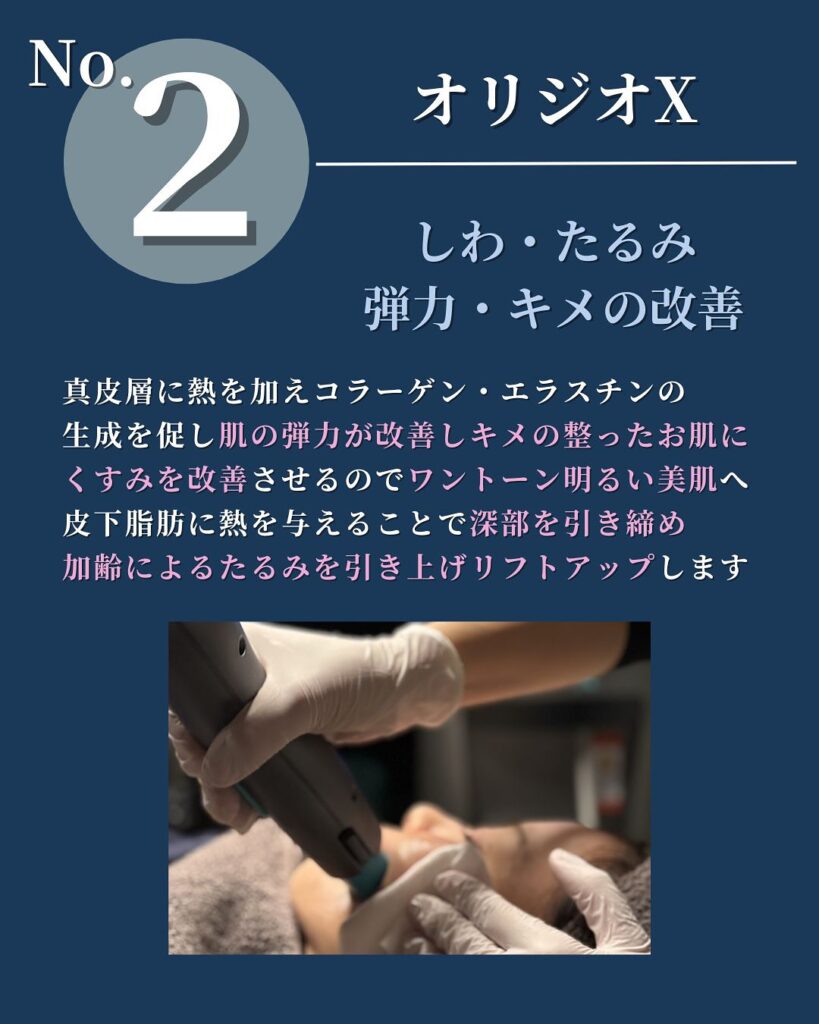 オリジオXは、真皮層と皮下脂肪層に熱を加えることでコラーゲン・エラスチンの生成を促す機器治療です。肌の弾力改善・キメの整った肌へのアプローチ・くすみ改善・リフトアップ効果が期待できます。