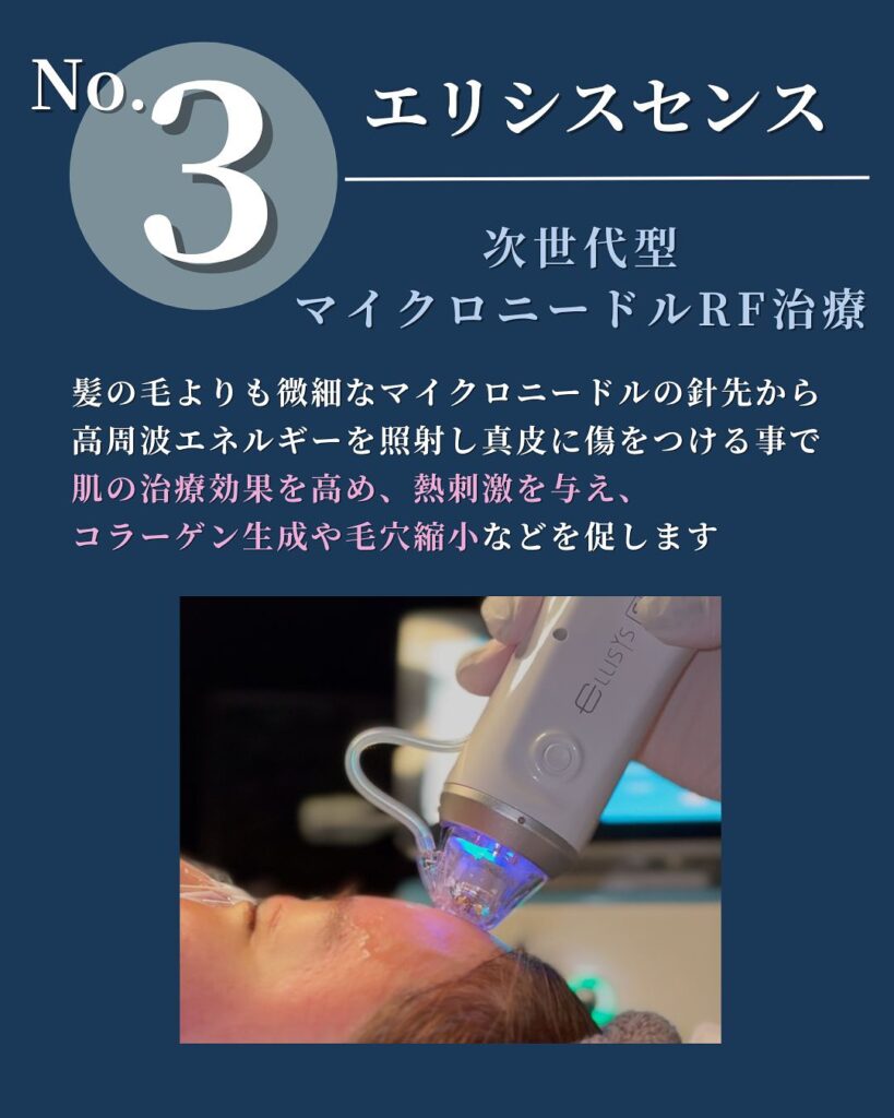 エリシスセンスは、髪の毛よりも微細なマイクロニードルの針先から高周波エネルギーを真皮に照射する、次世代型のマイクロニードルRF治療です。真皮に微細な熱刺激を与えることでコラーゲン産生を促し、毛穴縮小・肌質改善・ハリの向上が期待できます。
