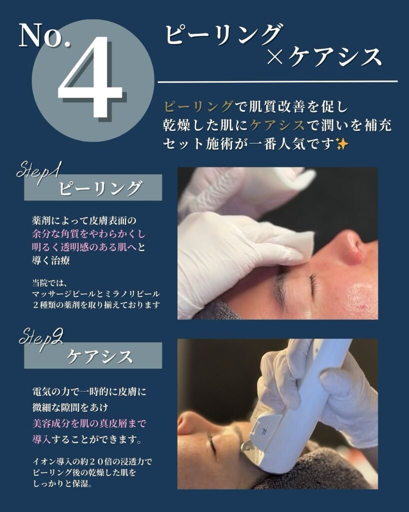 ピーリング後は角質が取れた分、肌が一時的に乾燥しやすい状態になります。そこでケアシスを組み合わせることで、ピーリング後の乾燥した肌に美容成分を真皮層まで導入し保湿します。ケアシスはイオン導入の約20倍の浸透力があるため、塗るだけでは届かない層まで成分を届けることができます。このセット施術が当院で最も人気の組み合わせです。
