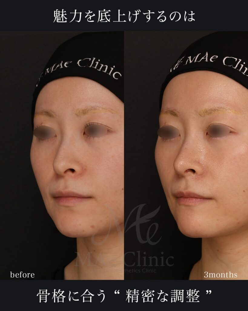 術後3ヶ月時点では、腫れも落ち着き、「大きく変えた印象はないのに、横顔が整って見える」状態になっています。