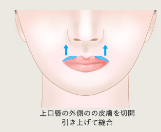 口角側の引き上げも同時に行いたい場合、別の選択肢として「外側人中短縮術」が検討されることがあります。これは上唇の縁(赤唇縁)に沿って直接皮膚を切除し、唇の両端を引き上げる方法です。