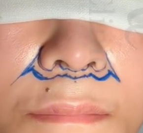 - 独自のカーブ設計: 中央だけを短くするのではなく、小鼻からほうれい線にかけて「どの程度の比率で皮膚を切り取るか」を患者様の骨格に合わせて緻密に計算します。鼻翼の広がり方や、元々の唇の厚みに合わせて切除幅を調整することで、不自然な引き連れを防ぎます。