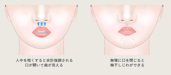 その結果、イラストのように「自然に口が閉じず常に歯が見える」状態や、無理に閉じようとして「顎に梅干しじわができる」といった機能的な違和感が生じやすくなります。これは中央一点に過度なテンションがかかり、口元の筋肉バランスが崩れることが原因です。