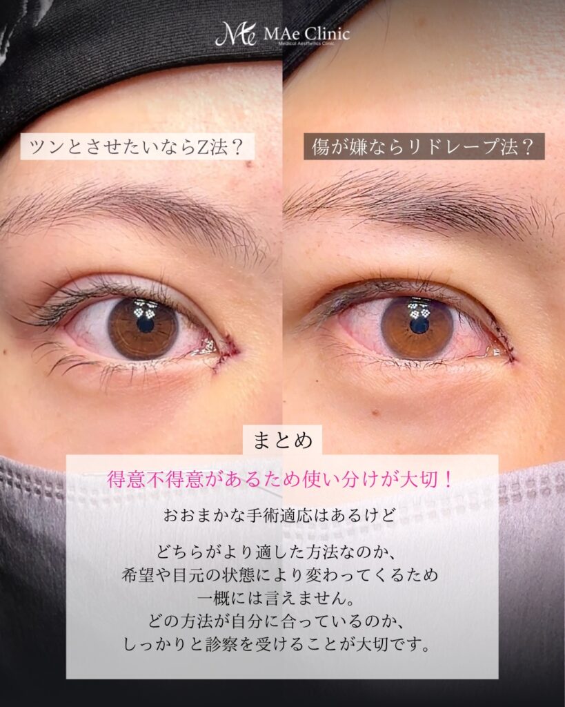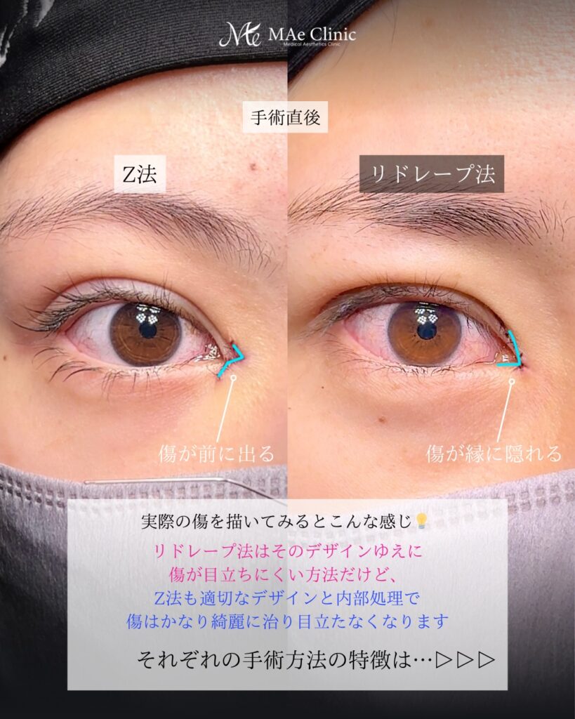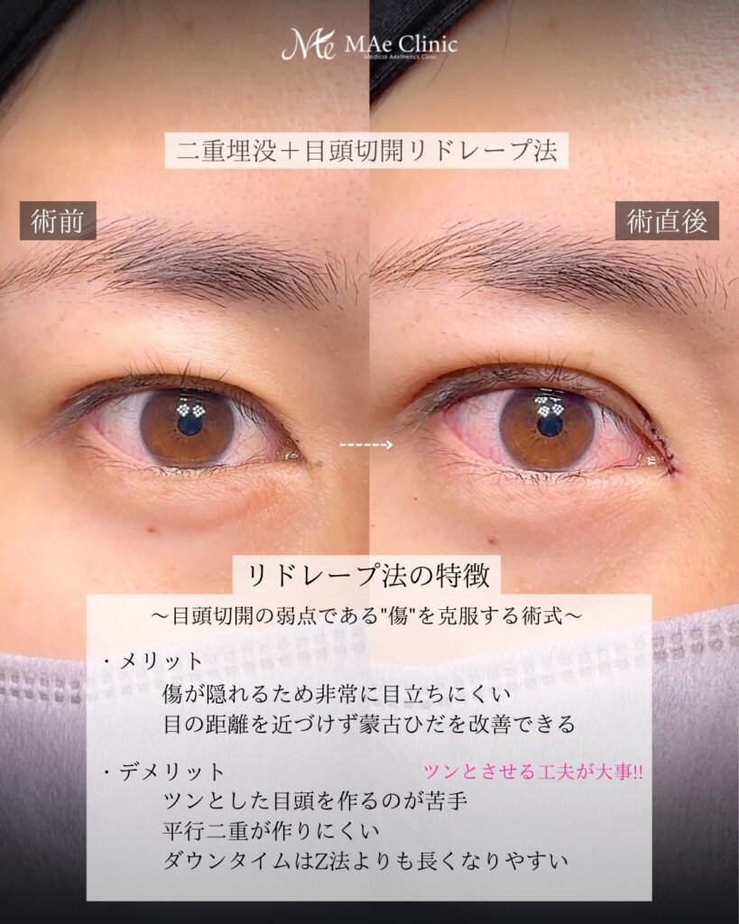 皮膚を入れ替えて鋭角を作るZ法とは違い、リドレープ法は仕上がりの目頭がやや丸みを帯びやすい傾向があります。