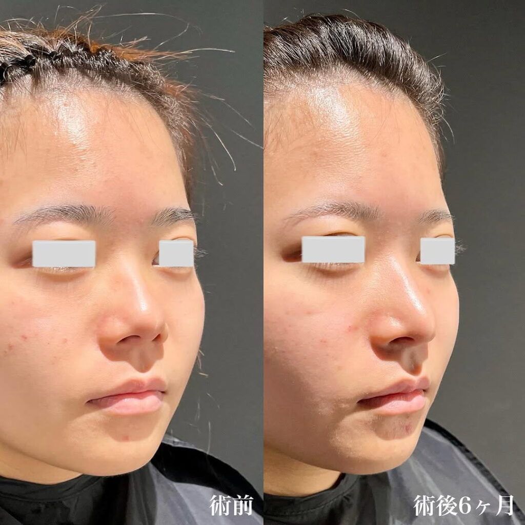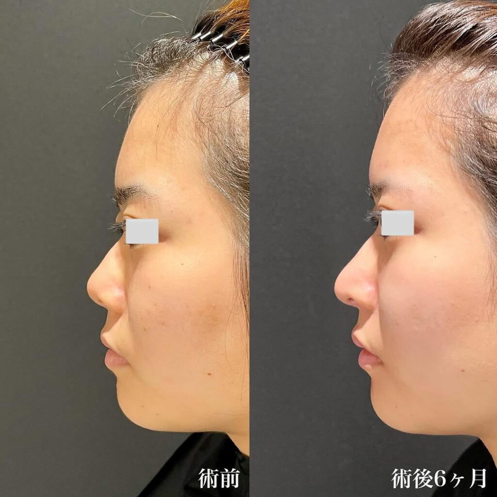 術後6ヶ月では腫れも完全に引き、鼻筋〜鼻先にかけてのラインがなめらかで、正面・斜め・横顔すべての角度で自然かつ美しい仕上がりとなっています。
