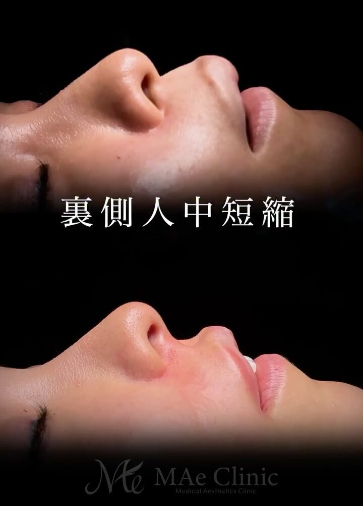 この症例では、人中がやや長く、上唇に厚みのあるタイプの方に対して、口腔内からのアプローチで行う「裏側人中短縮」を選択しました。