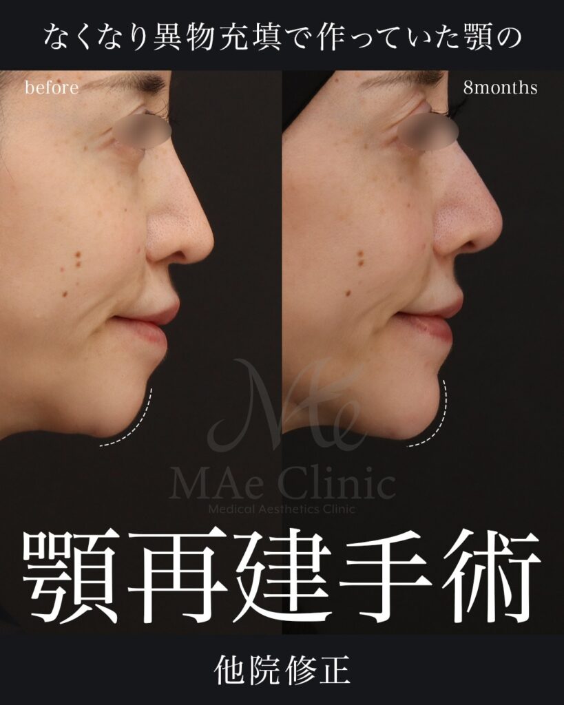 骨という硬い土台がない場所に、柔らかいヒアルロン酸などを繰り返し入れると、顎先がブヨブヨとした締まりのない質感になってしまいます。 今回の症例の患者様が長年悩まれていた「強い違和感」や「ブヨブヨした触感」は、まさにこの土台の不在と、異物が組織を圧迫し続けていることによる拒絶反応に近いサインなのです。
