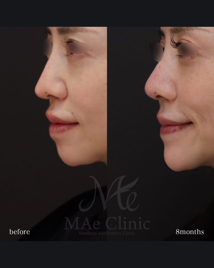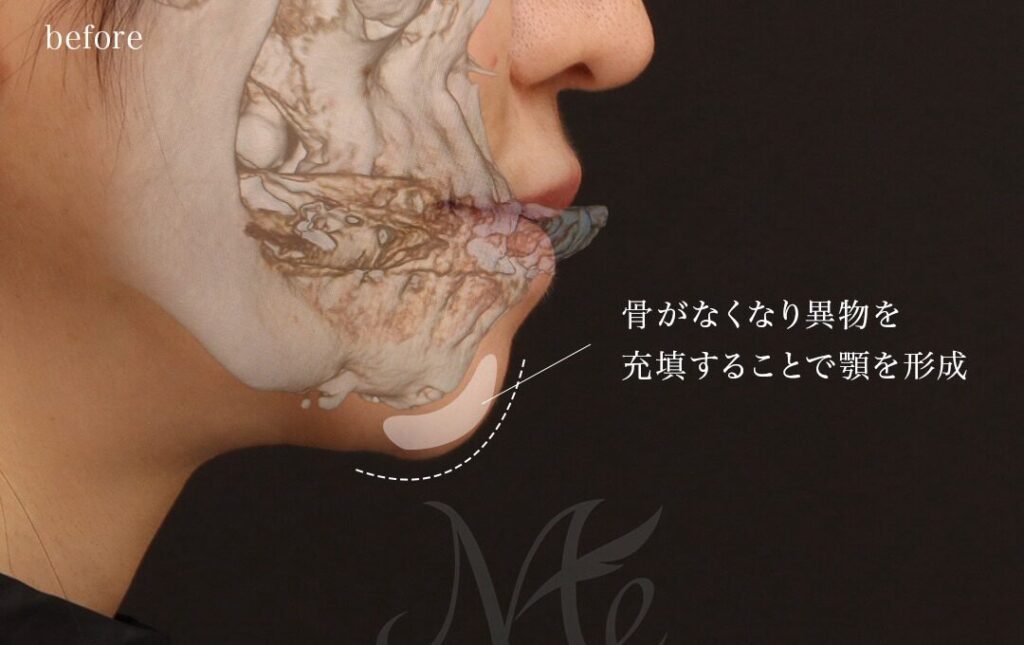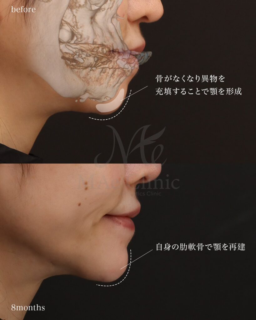 術前(before)の横顔を見ると、骨が失われた部分が凹み、その下の注入物だけが浮いているような、不自然な段差が見受けられます。 術後8ヶ月では、移植した肋軟骨が周囲の骨と一体化するように定着し、滑らかで力強い顎先のラインが形成されています。これにより、口元の突き出し感も改善され、上品な横顔へと変化しました。