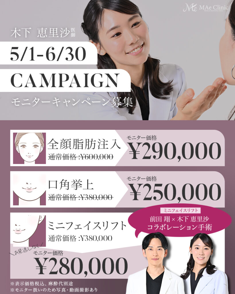 お顔の立体感を出す「全顔脂肪注入」や、明るい口元を作る「口角挙上」、そして前田翔医師とのコラボレーションによる「ミニフェイスリフト」を、モニター特別価格でご案内いたします。