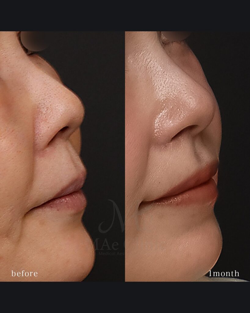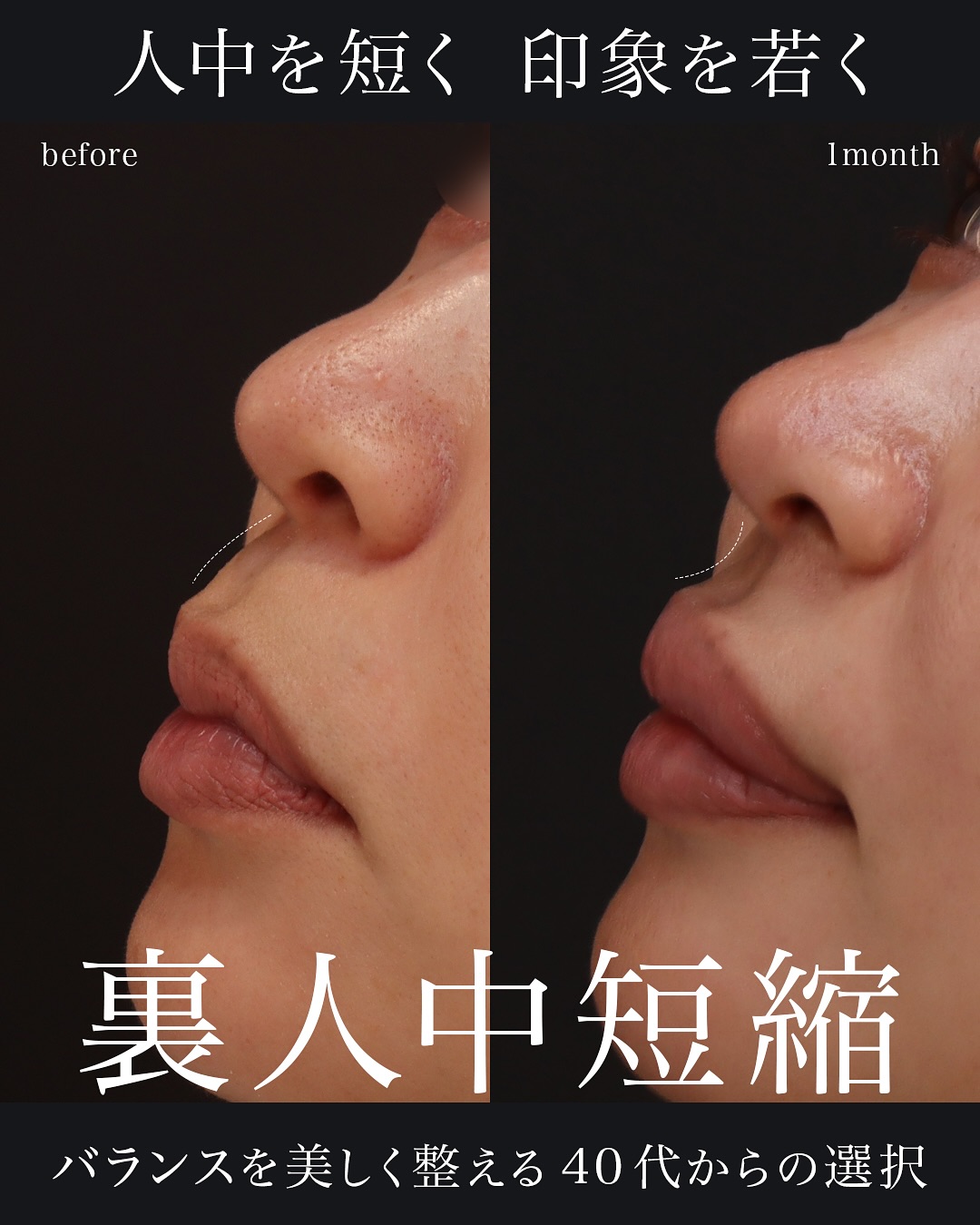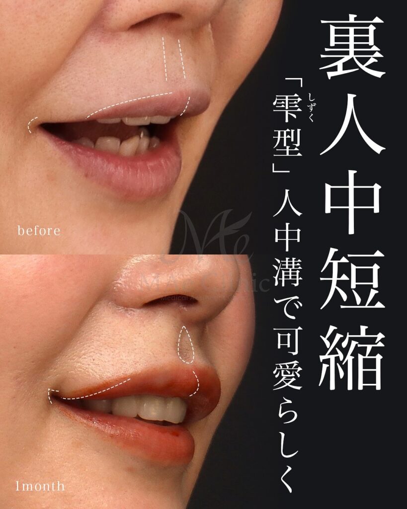 皮膚に傷がつかない人中短縮(裏人中短縮)・術後1ヶ月の症例です。「雫型」の人中溝が形成され、Cカールと立体感が生まれています。横顔からも人中の短縮と鼻唇角の変化が確認できます。