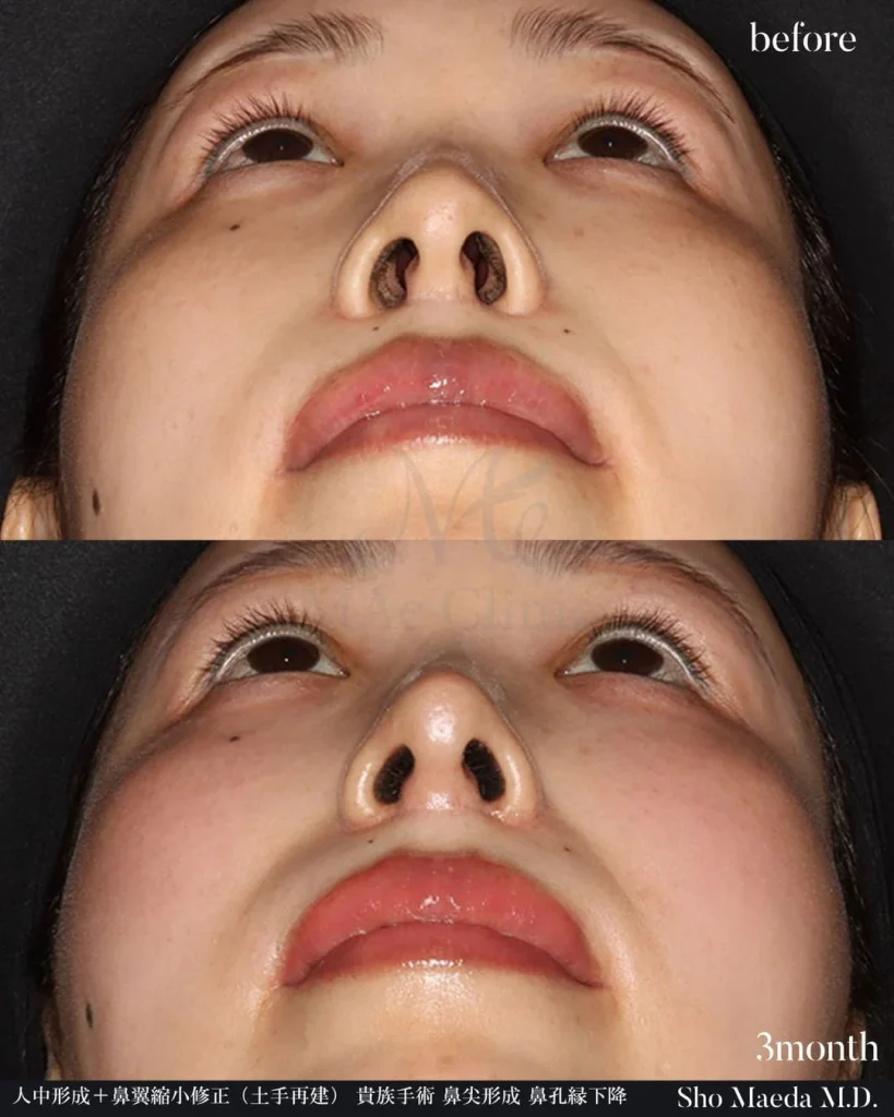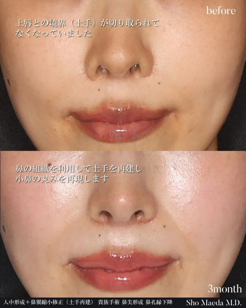 人中形成+鼻翼縮小修正(土手再建)・貴族手術・鼻尖形成・鼻孔縁下降の複合症例・術後3ヶ月。上唇との境界(土手)が切り取られてなくなっていた状態から、鼻の組織を利用して土手を再建し小鼻の丸みを再現しています。