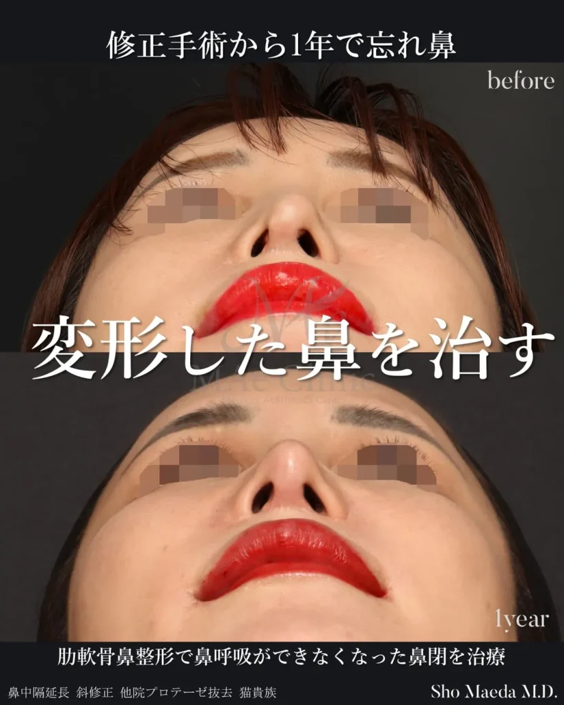 他院での肋軟骨鼻整形後に鼻閉・斜鼻が生じた修正症例・術後1年です。鼻腔内に横たわった軟骨とプロテーゼを除去し、肋軟骨で鼻中隔を土台から再建しています。元の鼻中隔軟骨が溶けていたため、骨に軟骨を固定するという難度の高い対応が必要でした。1年間の経過観察を経て完成しています。再手術はダウンタイムも長くトラブルも起きやすいため、長期の経過観察が重要です。