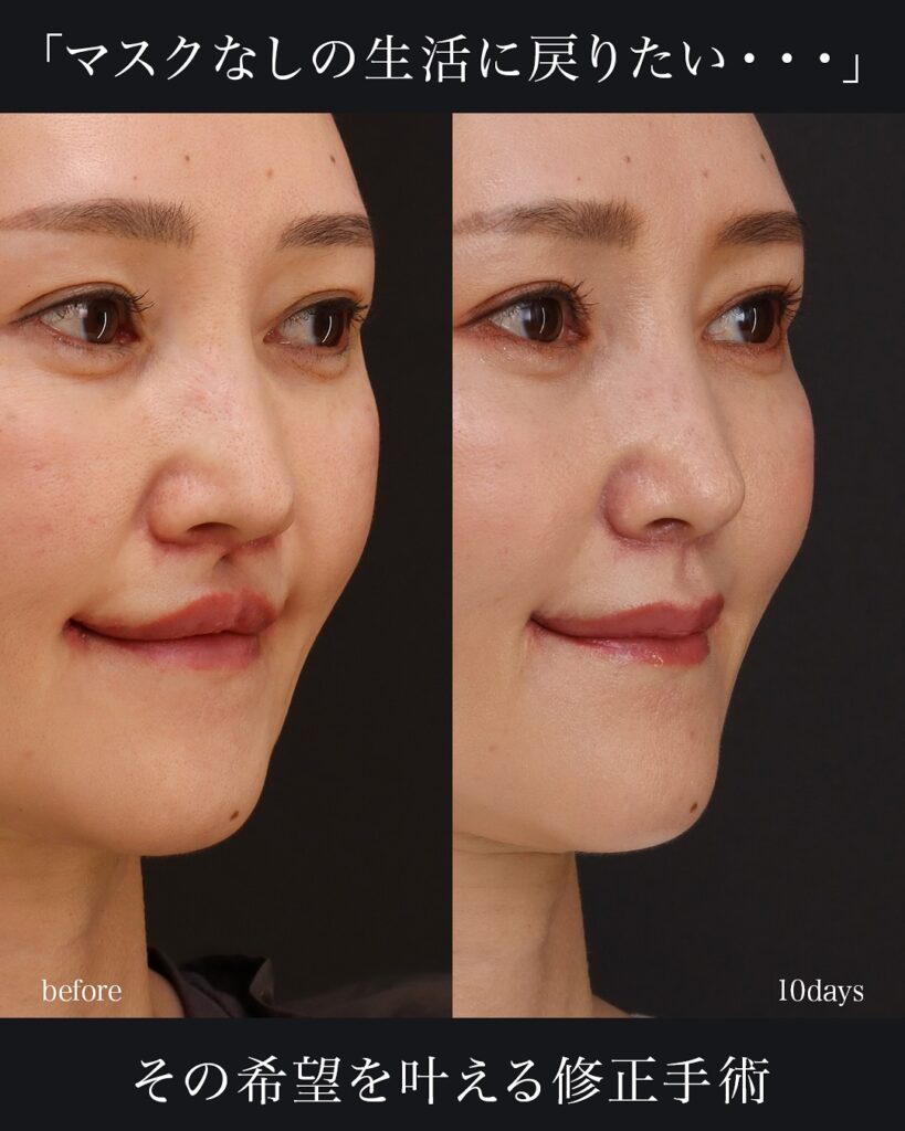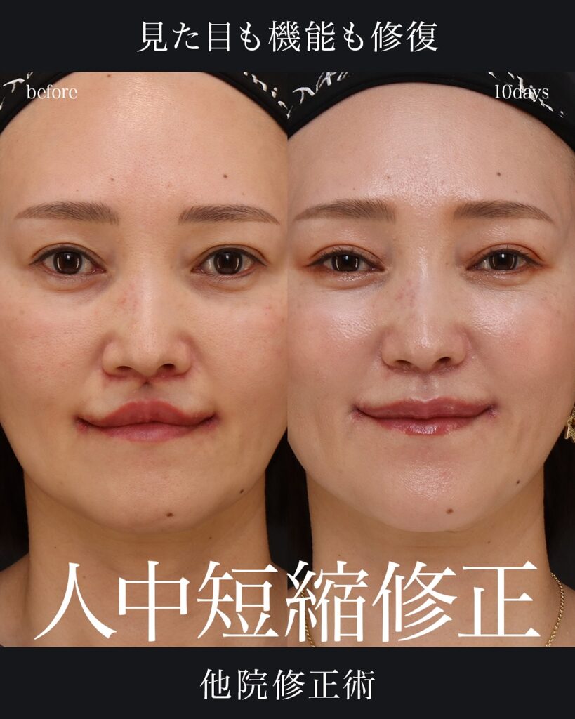 他院で人中短縮・人中窩形成・厚み調整を受けた後、人中の形が不自然になった方の修正症例・術後10日です。口腔内からアプローチし、外側に新たな傷を作ることなく修正しています。人中部は機能的にも審美的にも重要な領域で、顔面解剖への深い理解と繊細なバランス感覚が求められます。