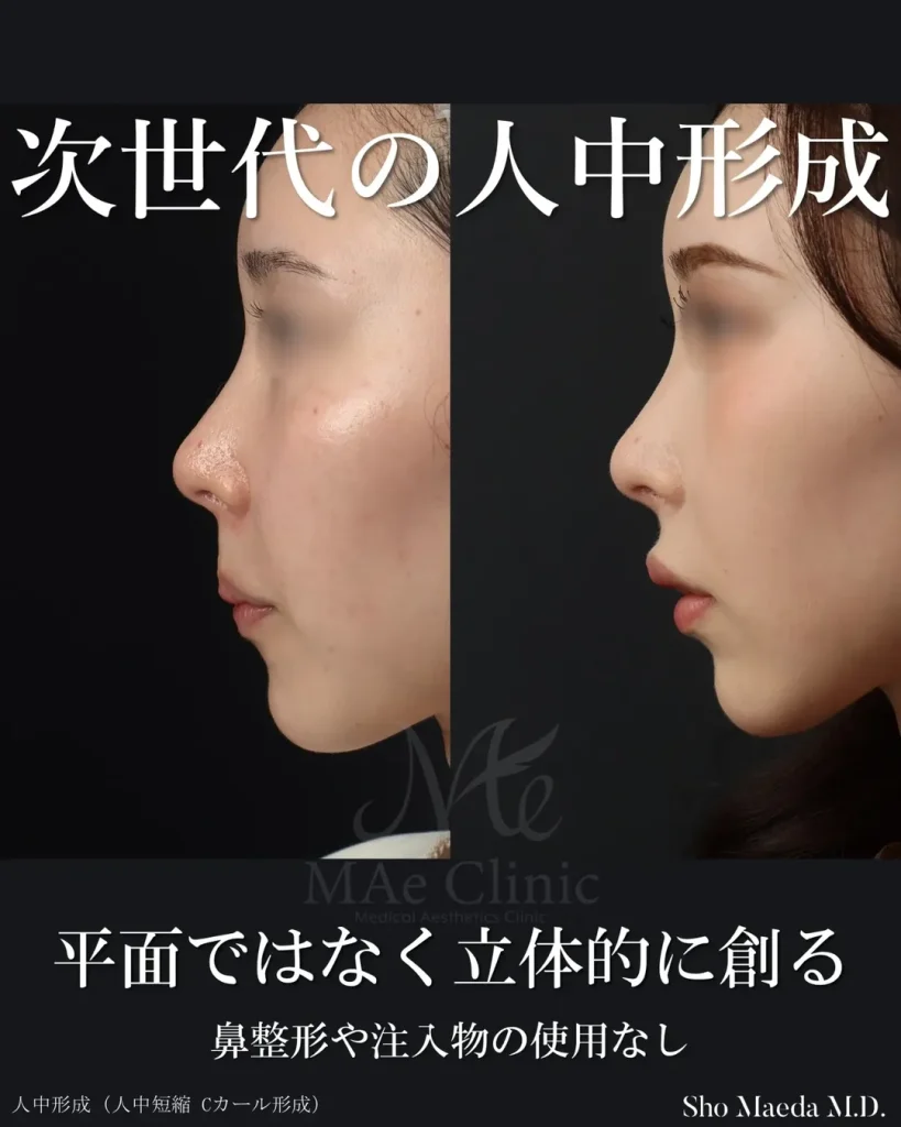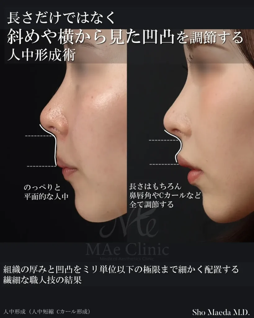 クリニックによって手法は様々だと思いますが、前田翔医師の考案した皮膚に傷がつかない人中短縮(裏人中短縮)では単に人中を短くするだけでなく、鼻唇角・Cカール・上唇の立体感まで含めた三次元的な調整を行います。口腔内から神経を保護しながら筋肉を精密に操作するため、高度な解剖学的知識と技術が求められる術式です。