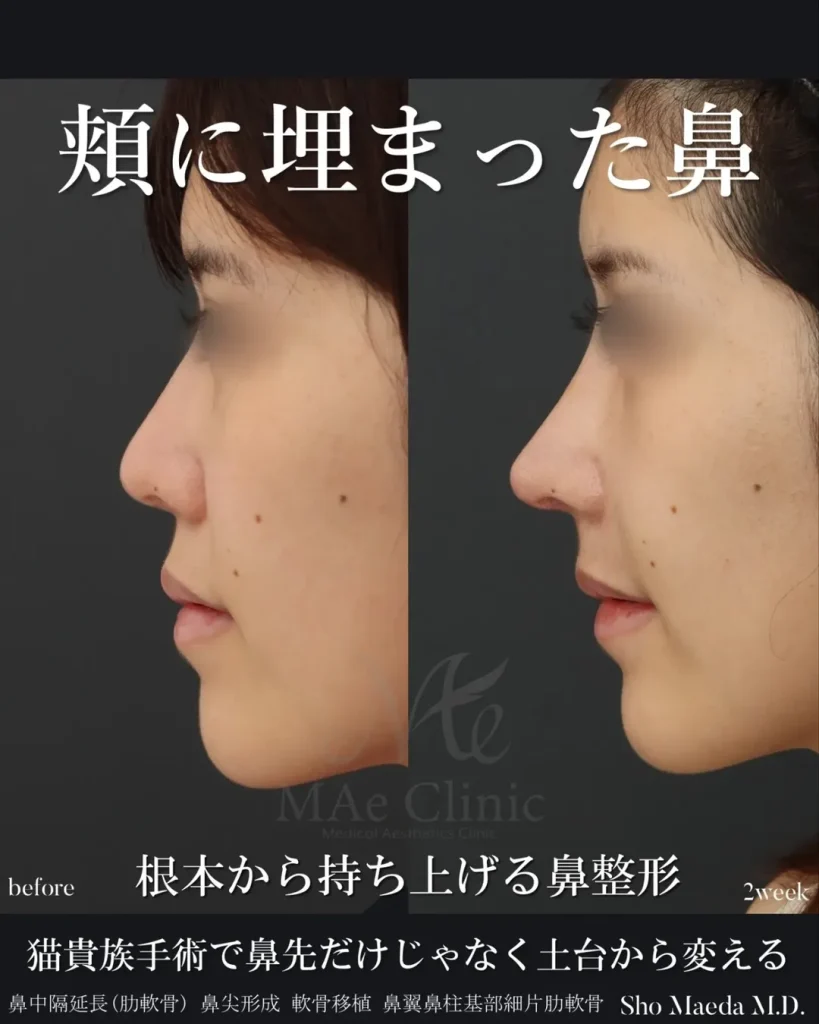 鼻中隔延長(肋軟骨)・鼻尖形成・軟骨移植・猫貴族手術の複合症例・術後2週間。小鼻の根本が頬に隠れていた状態から、鼻全体が見えるようになりEラインも整っています。