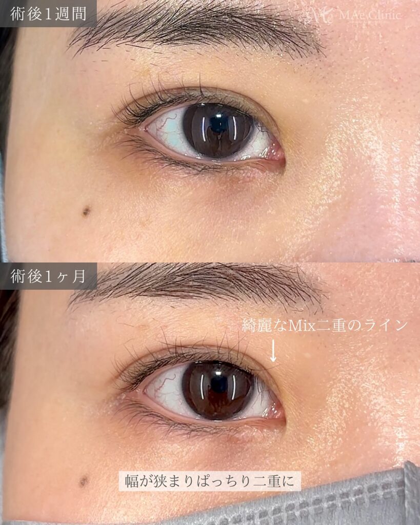 • 術後1ヶ月: 幅が安定し、ぱっちりとした自然な二重に。