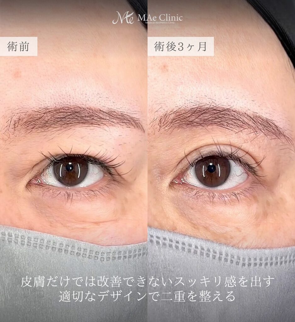 - まぶた全体の軽さとスッキリ感の獲得: 術前は重さがありましたが、術後3ヶ月で目尻のたるみが解消され、皮膚切除だけでは実現しにくい根本的なスッキリ感が出ています。これは、余分な皮膚に加え、分厚いROOFや眼輪筋が適切に切除された確かな証拠です。