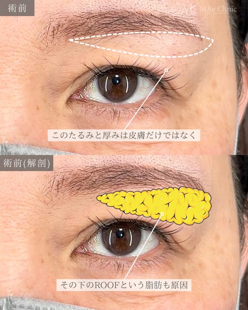 - 役割と影響: ROOF (Roof of Orbit Fat) は、眉骨(眼窩)の縁の下に存在する、線維性の強い脂肪層です。特に目尻側で分厚くなりがちで、これが重さやたるみを助長します。