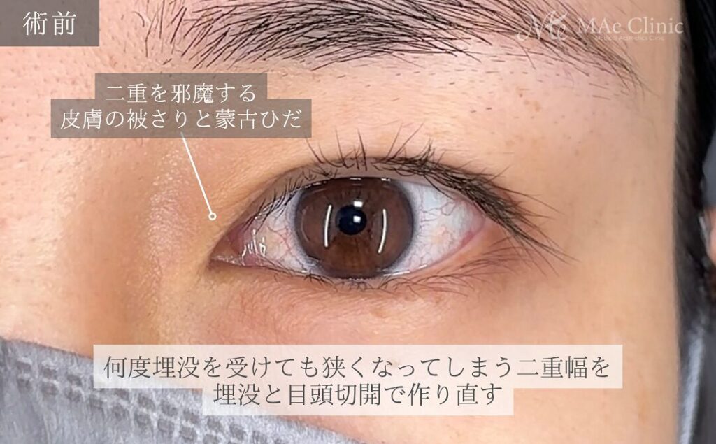 この患者様は、過去に何度も埋没法を受けていましたが、蒙古ひだと皮膚の被さりが邪魔をして、目頭側の二重幅が狭くなってしまっていました。「埋没法だけでは限界がある」典型的な例です。