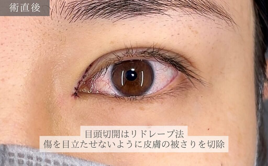 リドレープ法による目頭切開の直後です。傷が目の縁に沿っており、顔の前面に出ていないことが分かります。直後は糸がついているため目立ちますが、抜糸後は急速に目立たなくなっていきます。