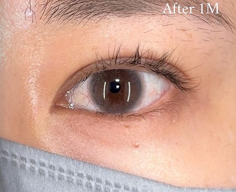 • 術後1ヶ月: 赤みがほとんど引き、傷跡も非常に目立ちにくくなっています。二重の幅も落ち着き、非常にナチュラルな仕上がりです。ここから3〜6ヶ月かけて、傷跡はさらに白く、目立たなくなっていきます。
