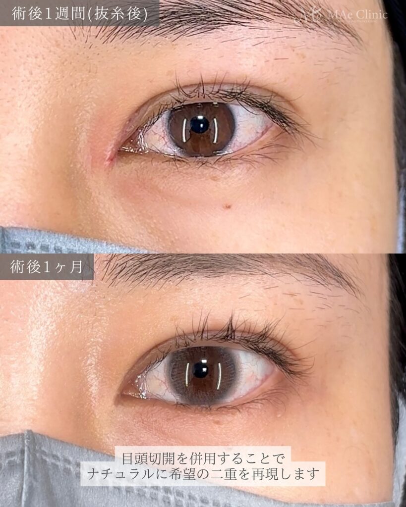 • 術後1ヶ月: 目頭切開を併用したことで、目頭側の被さりが解消され、綺麗な二重ラインが実現しました。目の横幅が自然に広がり、黒目も大きく見えるようになったことで、華やかで洗練された印象の目元になりました。