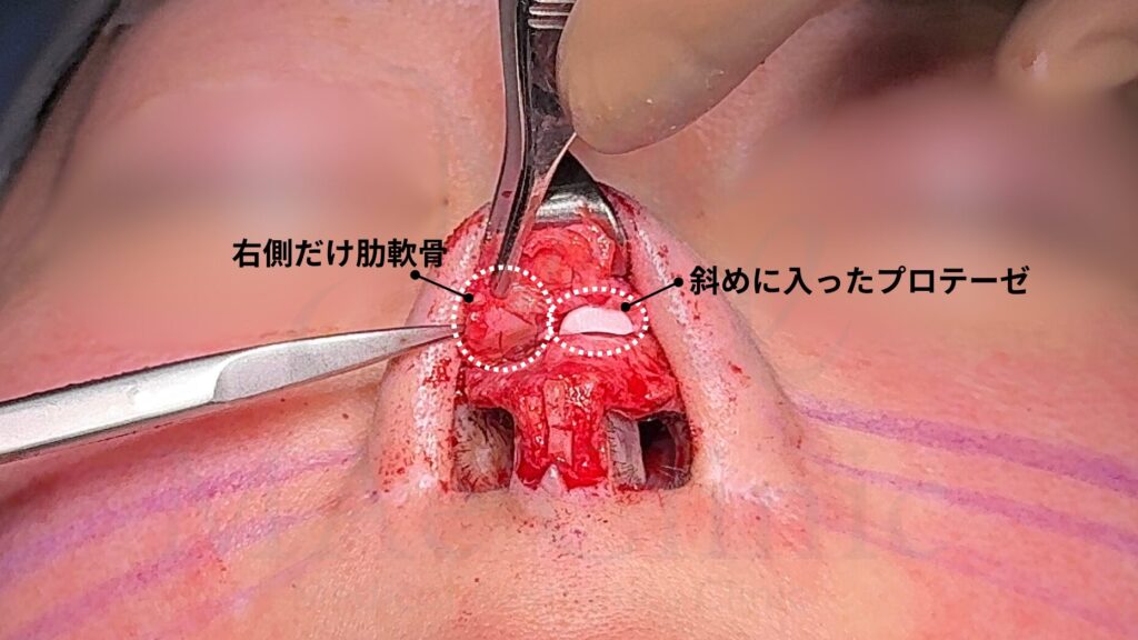まず、プロテーゼが斜めに入っていました。鼻筋が曲がっていたのはそのためと考えられますが、プロテーゼの右側にのみ肋軟骨が固定されており、左側にはありませんでした。意図的な調整だったのか、施術上のばらつきだったのかは判断できませんが、左右で異なる構造になっていたことは確かです。