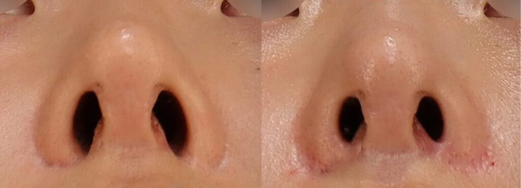 鼻柱の支え(いわゆる“土手”)がなくなると、鼻の穴が縦長に広がり、中央が平坦に見えます。