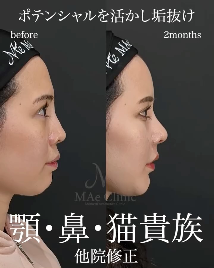 鼻中隔延長(肋軟骨使用)で鼻先を下方向・前方向に延ばし、鼻尖形成・鼻尖軟骨移植でシャープな鼻先に整えています。猫貴族手術(肋軟骨使用)で中顔面の土台を前方に押し出し、中顔面の立体感を作っています。鼻と中顔面をまとめて整えることで、正面・横ともに自然なバランスが生まれます。