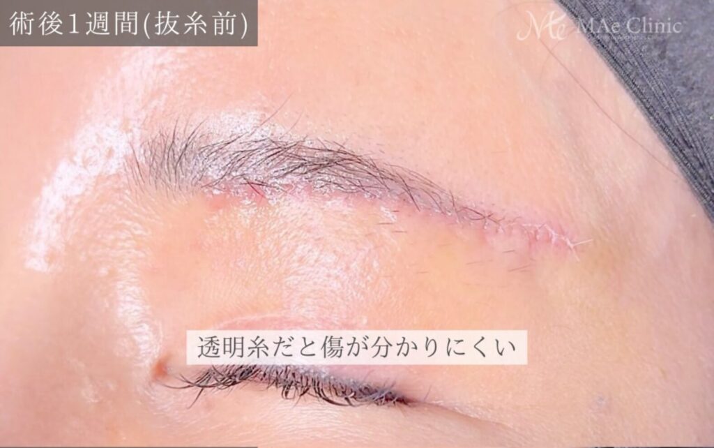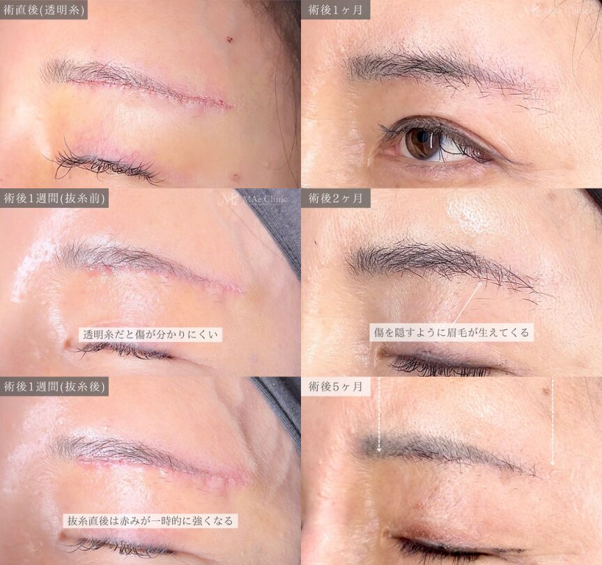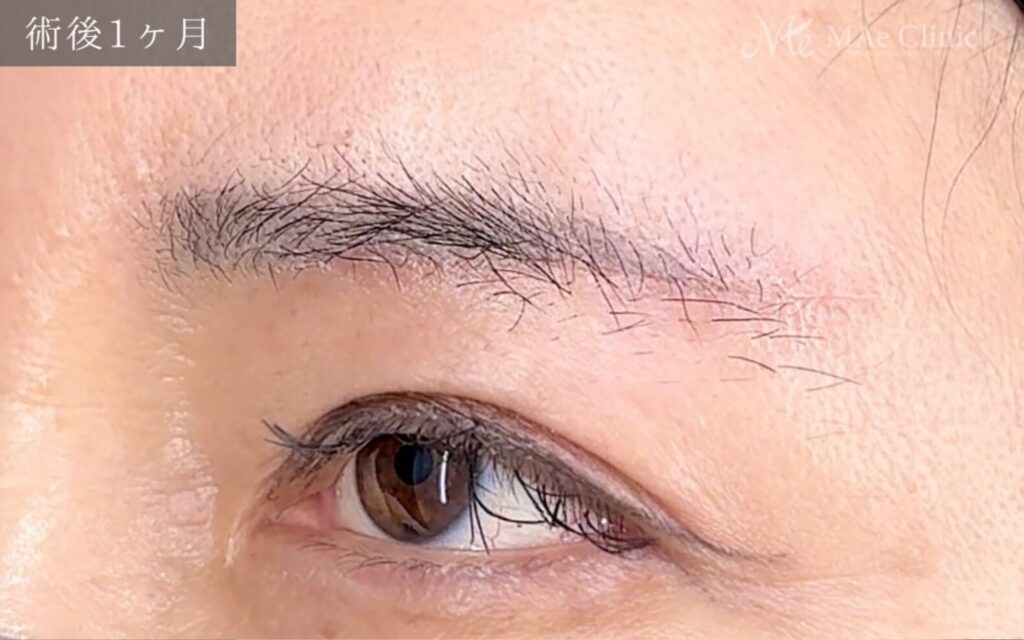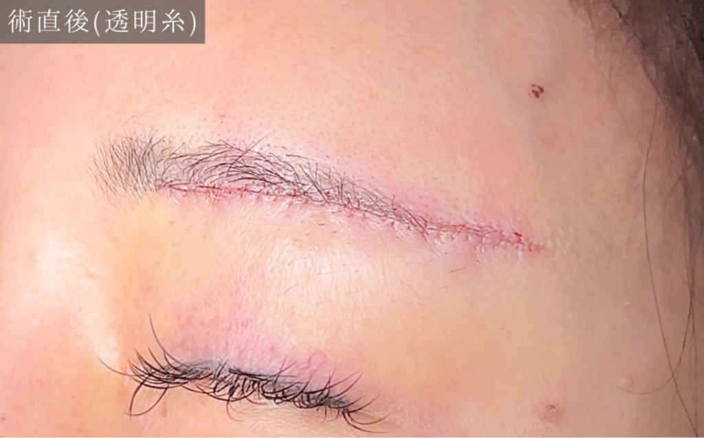 - 毛根を温存する切開: 眉毛の毛根を傷つけない角度で切開を行うことで、術後に傷跡をまたいで眉毛が生えてくるように工夫しています。